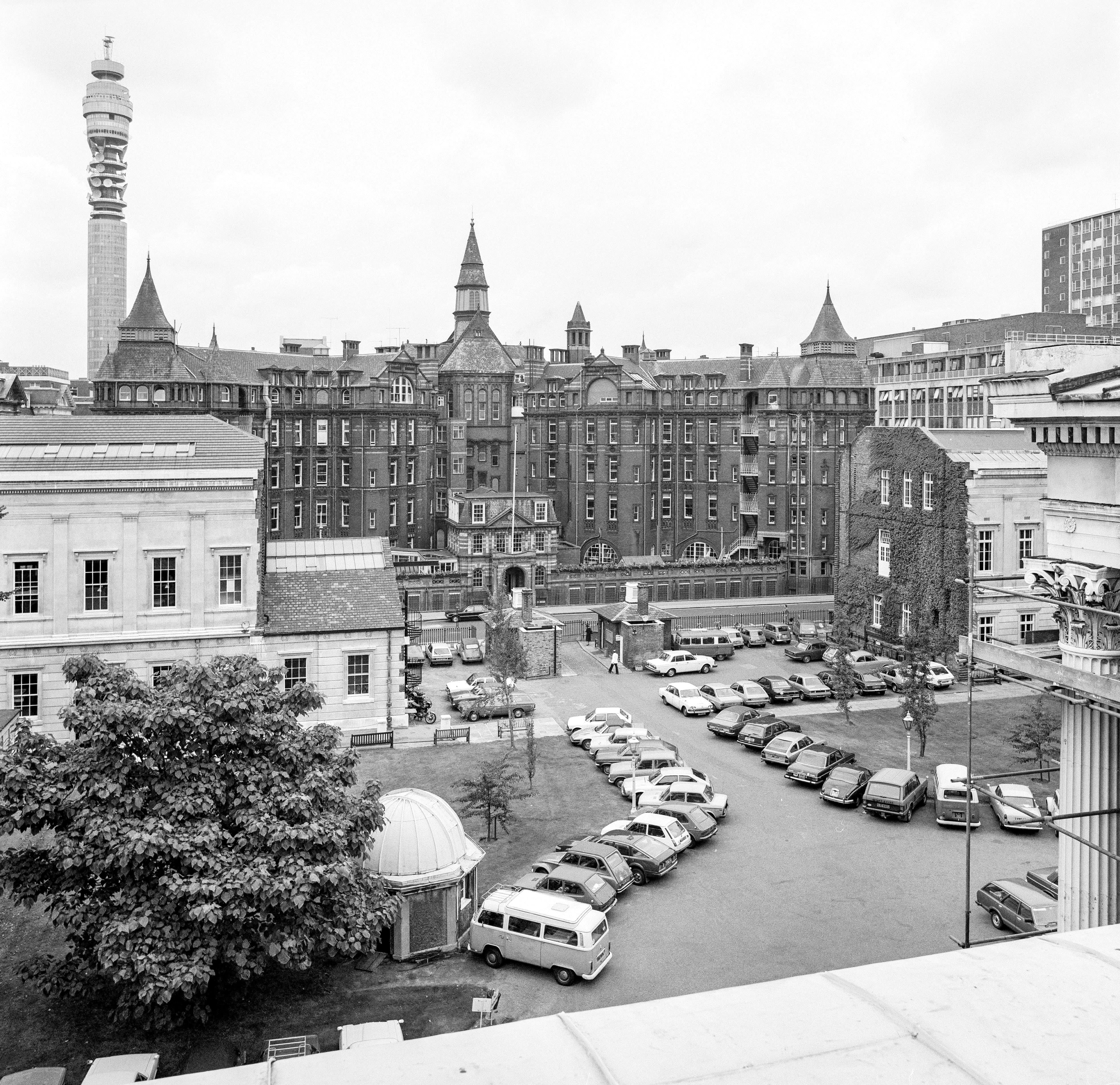 View of the Main Quadrangle from the east c.1980, when it was still used for car-parking, showing the unfinished South-West and North-West Wings. © UCL Digital Media