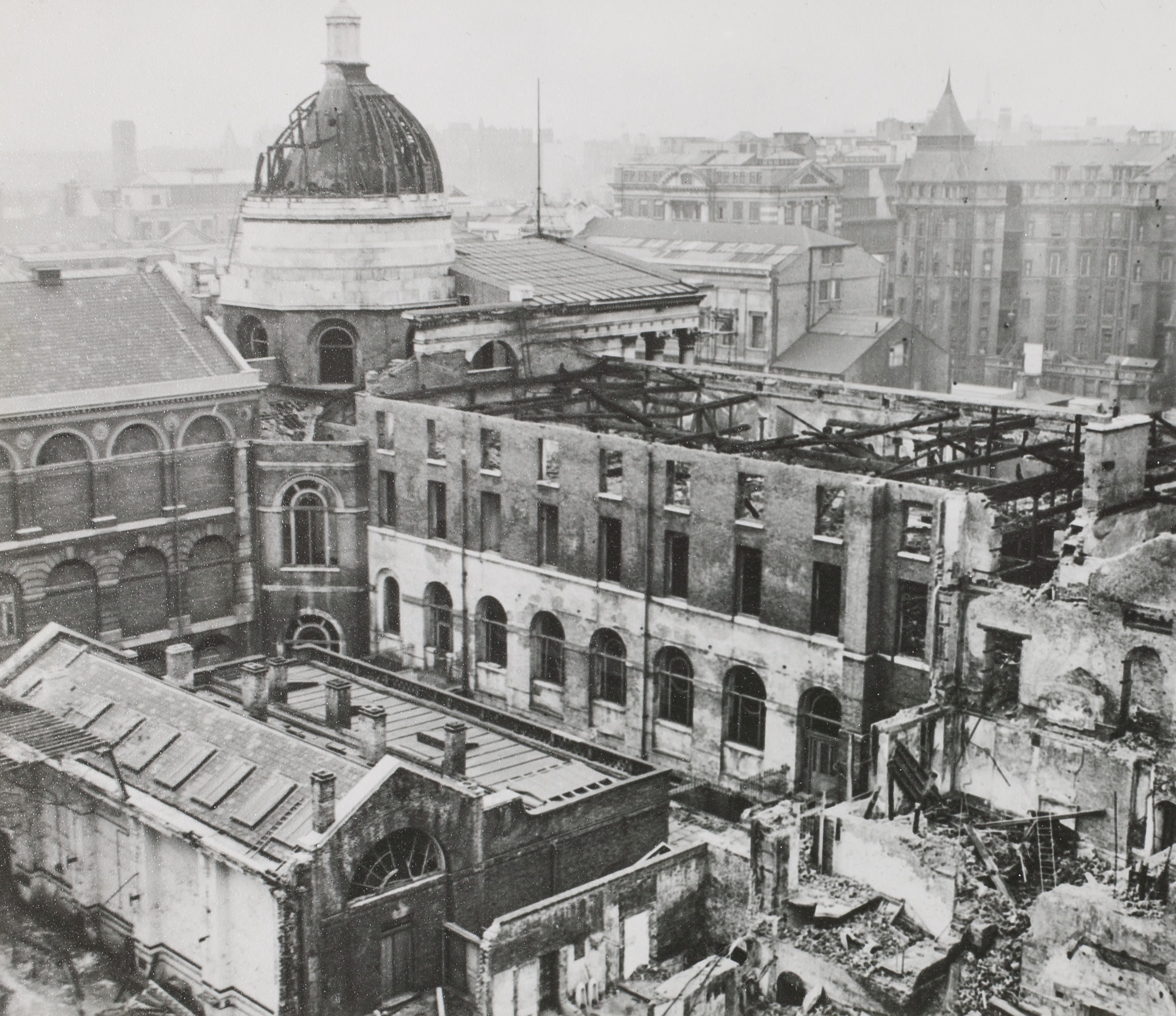 View of the Wilkins Building from the north-east in 1940, showing the bombed-out north range and the dome, before a major post-war restoration overseen by Professor A. E. Richardson, UCL’s Chair of Architecture. © UCL Creative Media Services