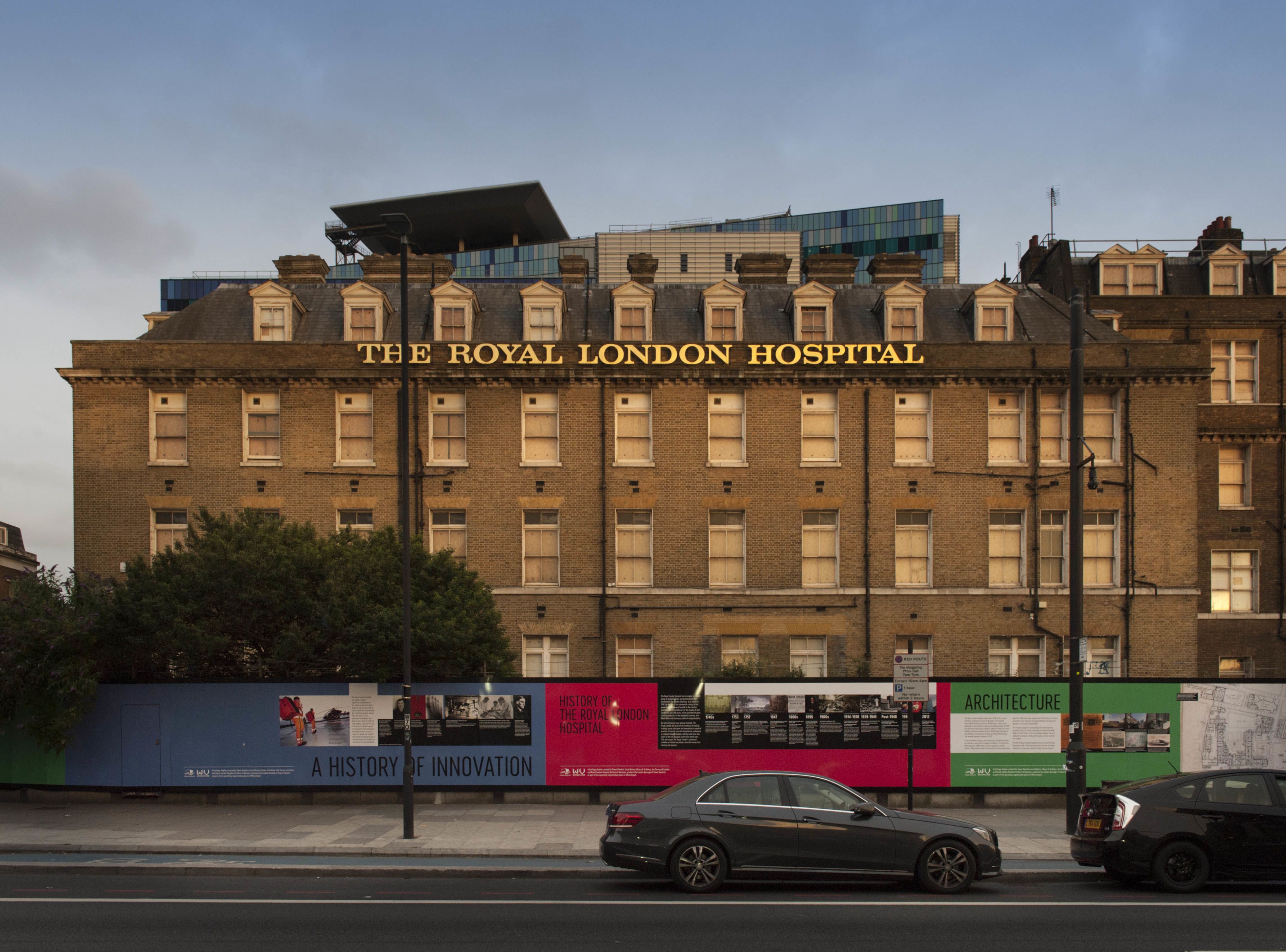 The Royal London Hospital, Whitechapel Road, view from the north in 2017, showing hoardings created in a collaboration between the Survey of London, Tower Hamlets Council, Tower Hamlets Local History Library & Archives, and the Royal London Hospital Archives at Barts Health NHS Trust. © Photograph by Derek Kendall for the Survey of London