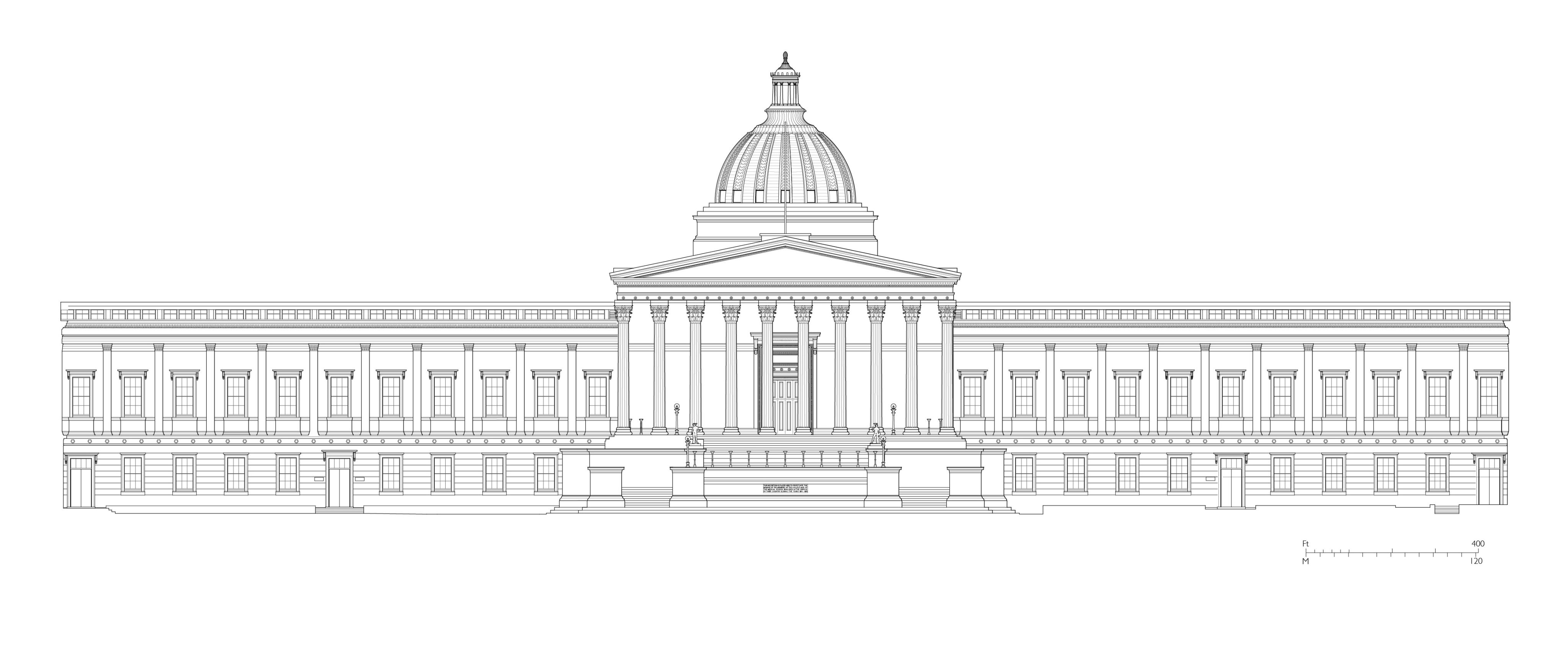 West front of the Wilkins Building in 2024. © Drawing by Helen Jones for the Survey of London, based on fieldwork and drawings kindly supplied by UCL Space Team